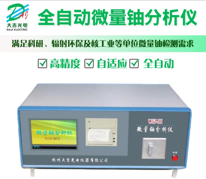 微量鈾分析儀WGJ-Ⅲ型由杭州大吉光電儀器公司自主研發生產,儀器設計采用紫外新光源,該光源的主要特點是性能穩定;所用的脈沖光管壽命可達5年,如用標準加入法能分析8萬個樣品。電路設計采用新穎的單片機,測試時的所有操作只要按中文提示輕輕點擊液晶觸摸屏上的對應選項,就可用標準加入法、曲線法分析樣品,由單片機直接進行數據處理,液晶屏顯示及打印機打印能同時給出終測試結果,大大減輕了測試工程師的工作量。該儀器設有RS232串行接口,可把測試數據直接輸入計算機。由于儀器具有精度高、檢測出限低、測量速度快、操作簡便、取樣量少等特點,從而可直接應用于地質勘探、核燃料工業部門、環境保護、工業衛生,食品檢驗及疾病控制系統等。
